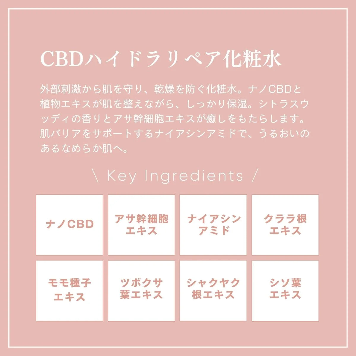 外部刺激から肌を守り、乾燥や荒れを防ぐCBDハイドラリペア化粧水。新シリーズの1番目のステップとして、肌を整えながらしっかり保湿する化粧水です。浸透性に優れたナノCBDをたっぷり配合し、肌の奥までうるおいを届けます。天然精油のシトラスウッディの香りとアサ幹細胞エキスが癒しをもたらし、スキンケアの時間を心地よいひとときに。