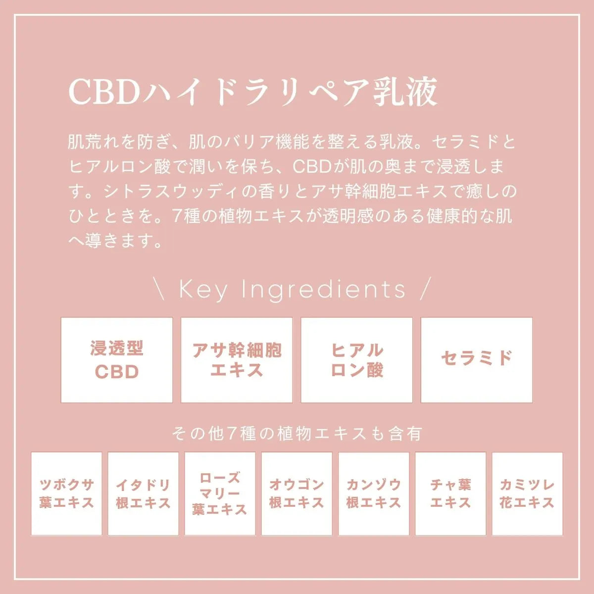 肌のバリア機能を整え、肌荒れを防ぐCBDハイドラリペア乳液。新シリーズの2番目のステップとして、肌のセラミドと水分量を補い保つ乳液です。高品質のCBDが浸透しやすくなっている処方で、肌の奥までうるおいを届けます。天然精油のシトラスウッディの香りとアサ幹細胞エキスが癒しをもたらし、スキンケアの時間を心地よいひとときに。