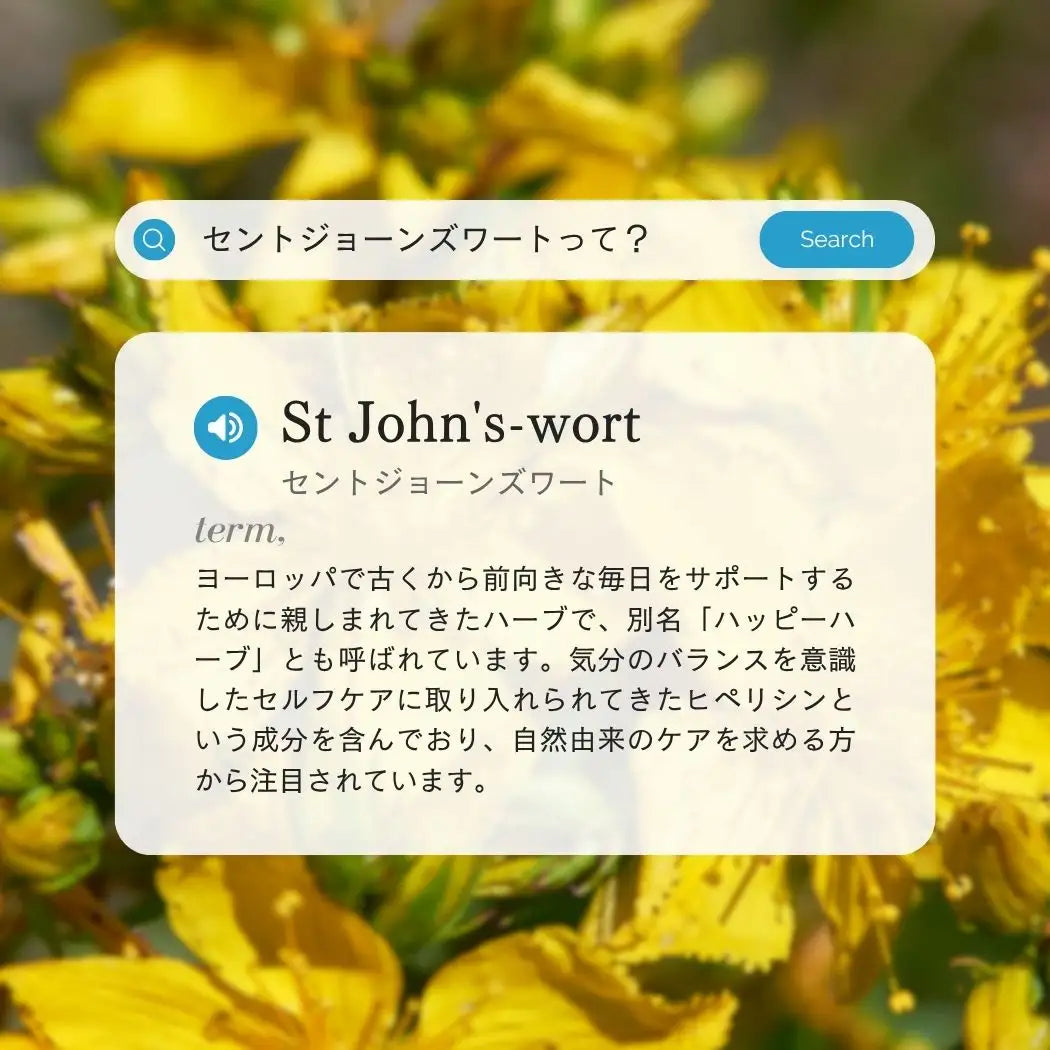 ヨーロッパでは伝統的に親しまれてきたこのハッピーハーブには、ヒペリシンが含まれ、毎日のセルフケアに取り入れたい成分として注目されています。さらに1食あたり30mgのCBDと組み合わせることで、ナチュラル志向の方にもうれしい植物由来のダブルサポート。