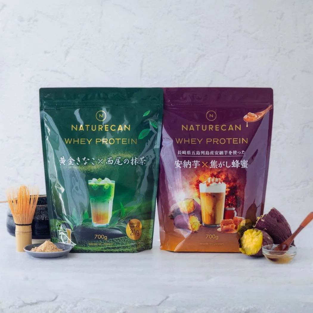 • 新ホエイプロテインフレーバー「西尾抹茶×黄金きなこ」「安納芋×焦がし蜂蜜」の2点セット