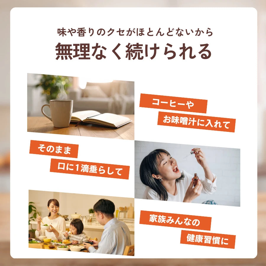 味や香りのクセがほとんどないため、コーヒー、ヨーグルト、スムージーなどいつもの一杯にプラスするだけ。無理なく自然に続けられ、ご家族全員の健康習慣として取り入れやすいドロップサプリです。